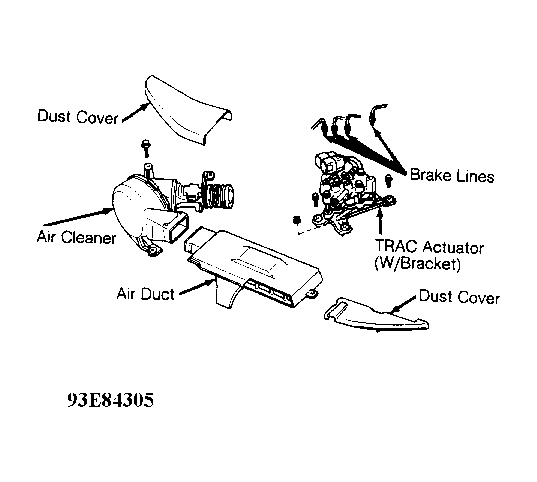 - Relieve high pressure fluid from accumulator. See BLEEDING BRAKE SYSTEM. Remove air cleaner, charcoal canister and ducting. Disconnect TRAC solenoid relay if necessary. Disconnect brake lines from actuator. Remove bolts and actuator assembly.