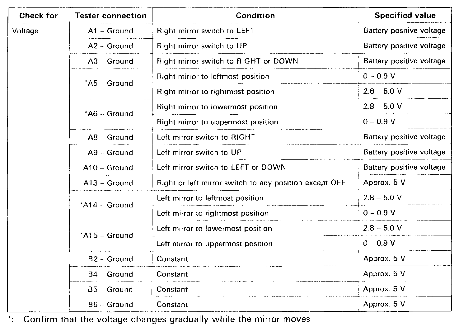 If operation is not as specified, inspect the wire harness and mirror switch or motor assembly. Then if these are correct, replace the ECU.