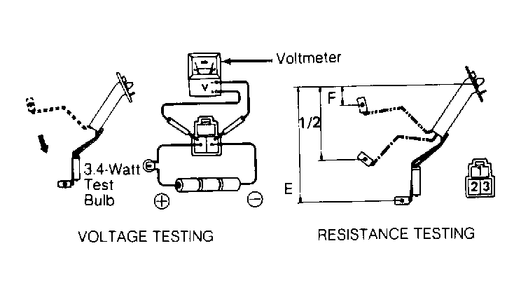 - Remove fuel gauge sending unit. See FUEL GAUGE SENDING UNIT under REMOVAL & INSTALLATION. Apply a 12-volt power source, through a 3.4-watt test bulb, to terminal No. 1. See Figure. Connect terminal No. 2 to ground.