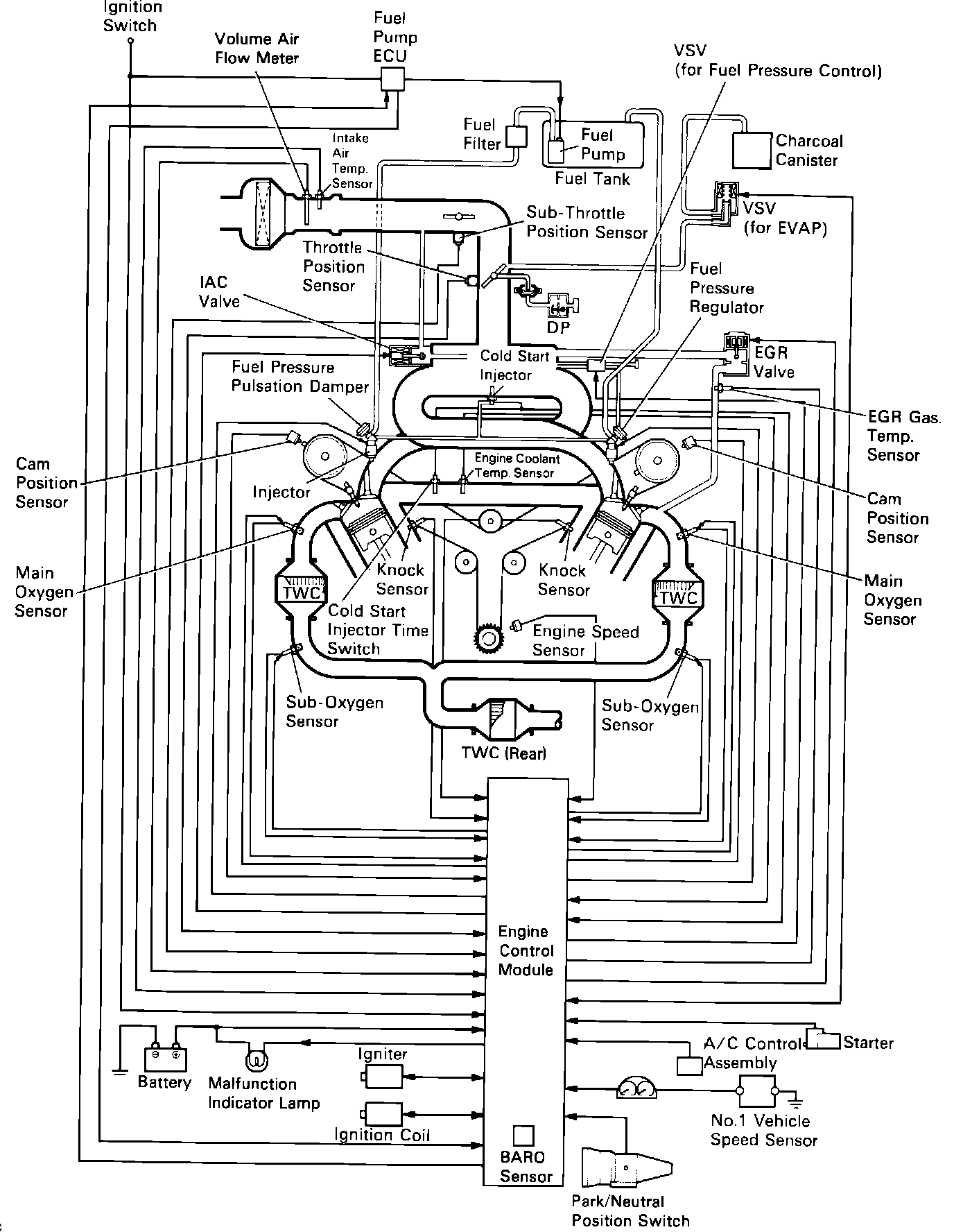 The vehicle ECM and sensor and output systems control virtually all aspects of engine operation. This combined systems control allows the engine to function at optimum performance while maintaining exceptable emission and fuel economy levels.