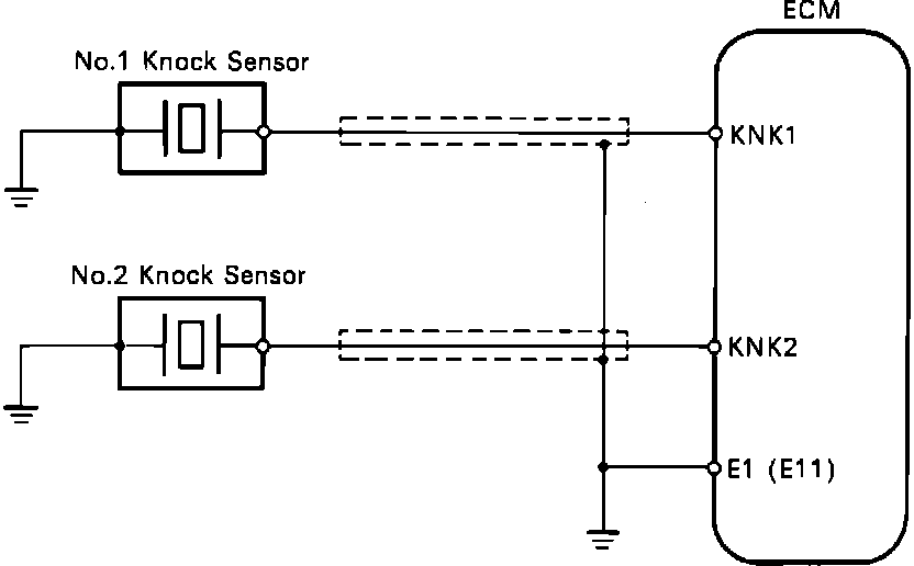 When the engine knocks (detonates), the piezo element resonates at the same frequency and produces a voltage that varies according to the amplitude of the knock. This voltage is the input signal to the ECM. This signal is input to the ECM through pins KNK1 and KNK2.
