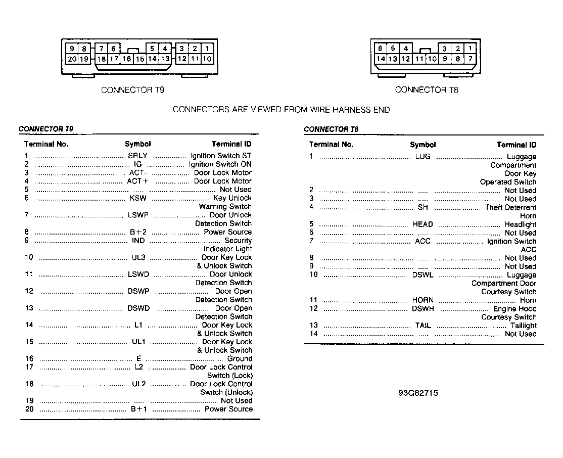 All voltage and resistance checks are done under various conditions with theft deterrent ECU connectors disconnected. For theft deterrent ECU connector identification, see Figure. Measure voltage or resistance between theft deterrent ECU connector terminals as specified. If voltage or resistance is not as specified, repair vehicle wire harness or replace components as necessary.
