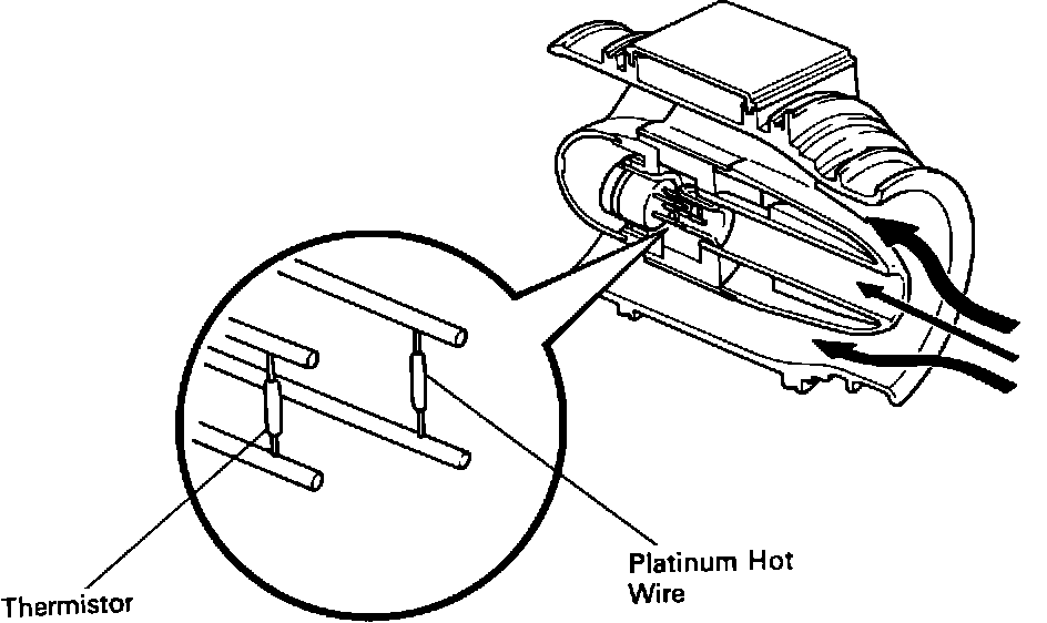 The sensor works on the principal that when the heated platinum wire is positioned within the air intake, the air volume can be measured by monitoring changes in hot wire temperature. The temperature change is measured by the thermistor. Circuit feedback maintains the platinum wire at a set temperature by controlling current flow through the circuit. The current flow is measured by the Engine Control Module as output voltage.