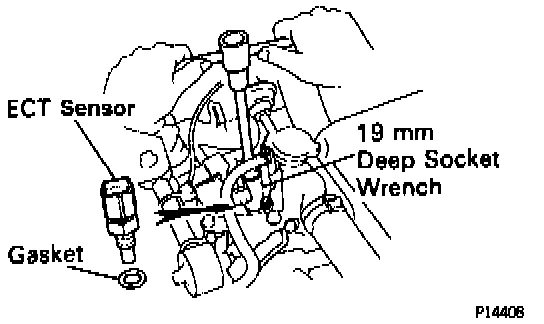 - Using a 19 mm deep socket wrench. remove the ECT Sensor and gasket.