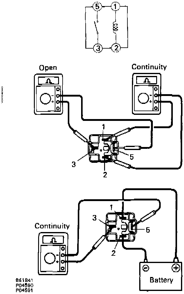 - Apply battery voltage between terminals 1 and 2 and check continuity between terminals 3 and 5.