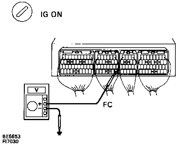 - Measure voltage between terminal FC of Engine Control Module and body ground.