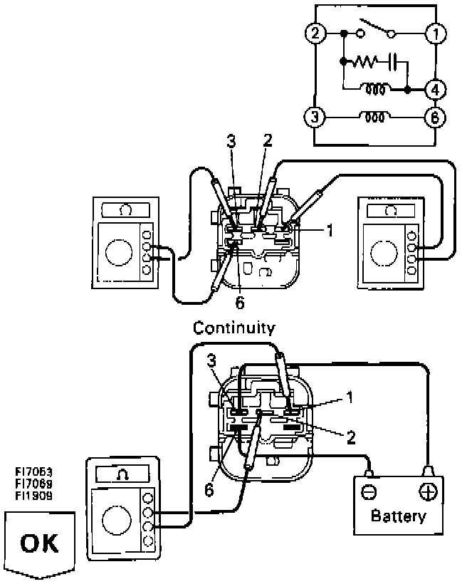 - Apply battery voltage between terminals 3 and 6. Check continuity between terminals 1 and 2.
