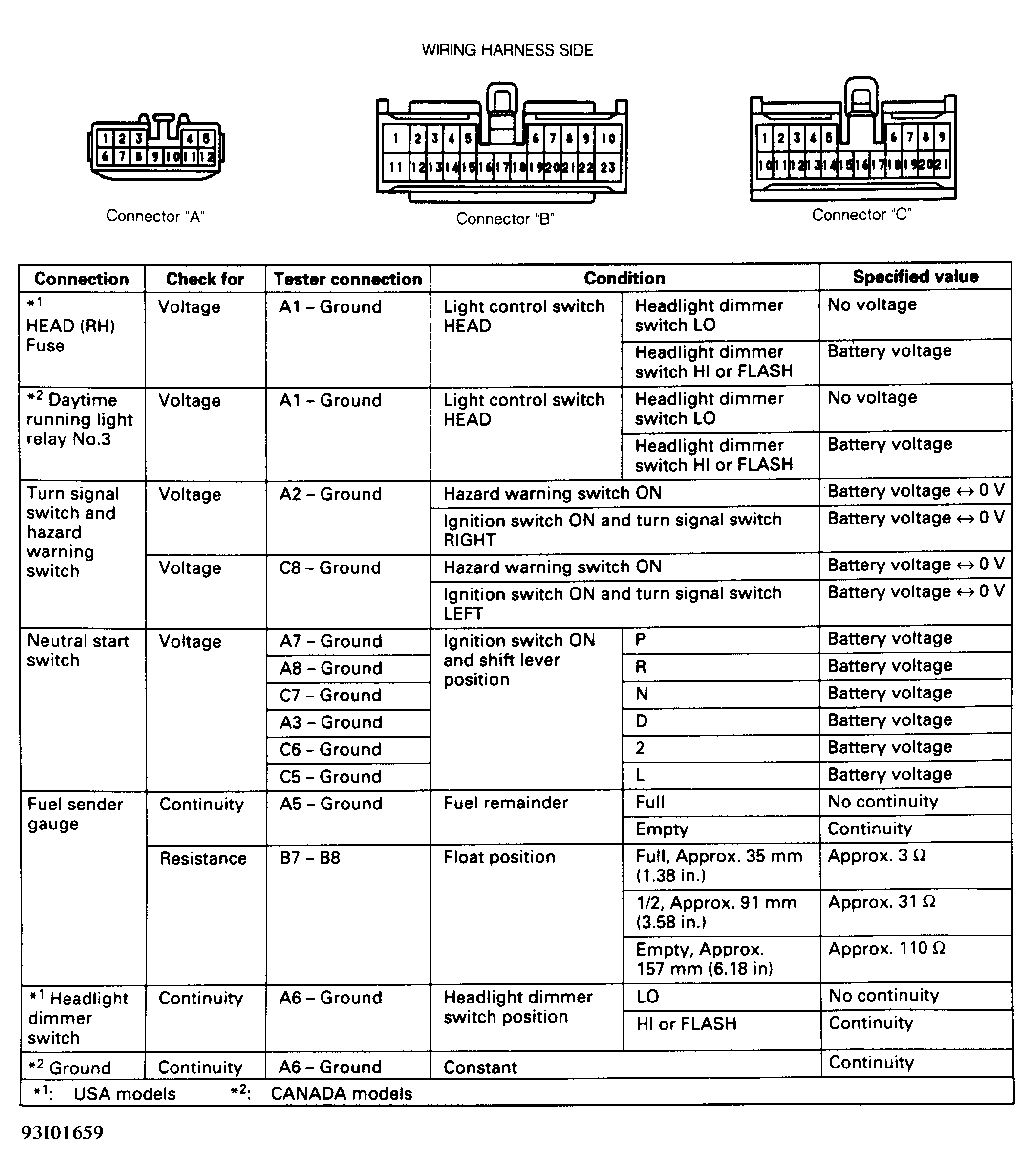 - Disconnect connector "B" from back of instrument cluster. See Figure. At instrument cluster connector "B", connect voltmeter positive lead to terminal No. 13 and negative lead to terminal No. 15. See Figure. Shift transmission into Neutral. Raise and support vehicle with one front wheel off of ground. Turn ignition on. Rotate front wheel.