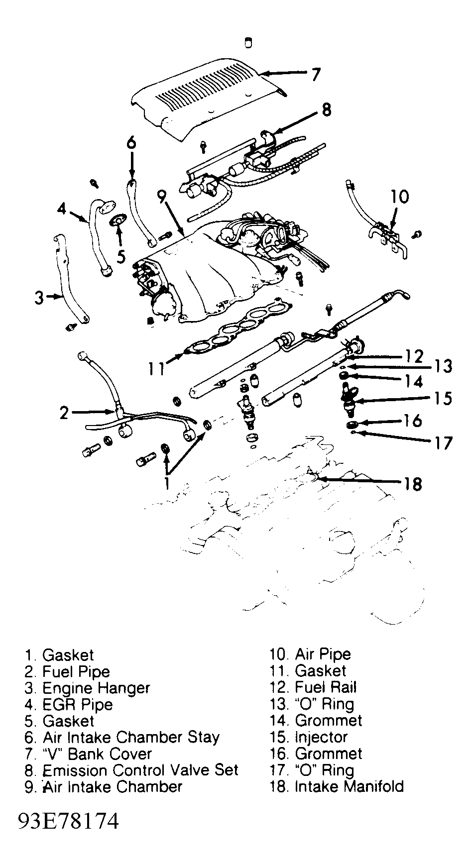 - Remove engine hanger. Remove bolt, and disconnect air intake chamber stay from chamber. Remove 2 bolts, nuts, air intake chamber and gasket. Disconnect 6 injector connectors. Disconnect wire harness from fuel rails.