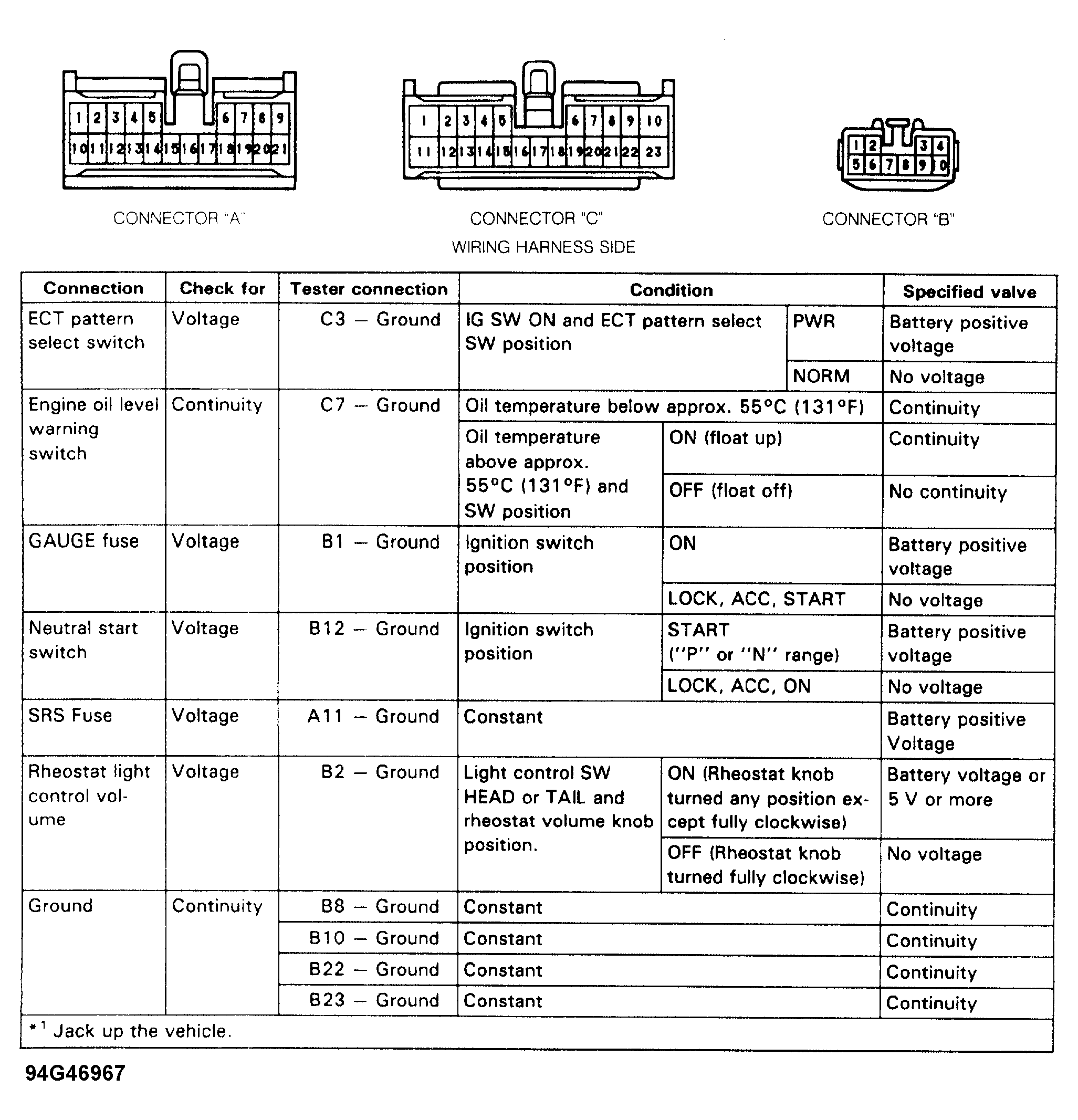 - Disconnect connector "C" from back of instrument cluster. See Figure. Raise and support vehicle with rear wheels off of ground. Turn ignition on. At harness side of connector "C", connect voltmeter between terminals No. 13 and 15. See Figure. Turn ignition on. Rotate drive shaft.