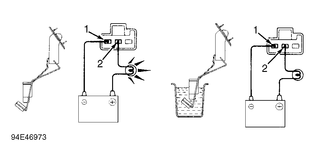 - Connect a 3.4-watt test light between battery positive terminal and sending unit connector. Test light should come on after a few moments. Submerge entire sending unit (or fuel level sensor portion) in a container of fuel. Test light should go out. If operation is not as specified, replace sending unit.