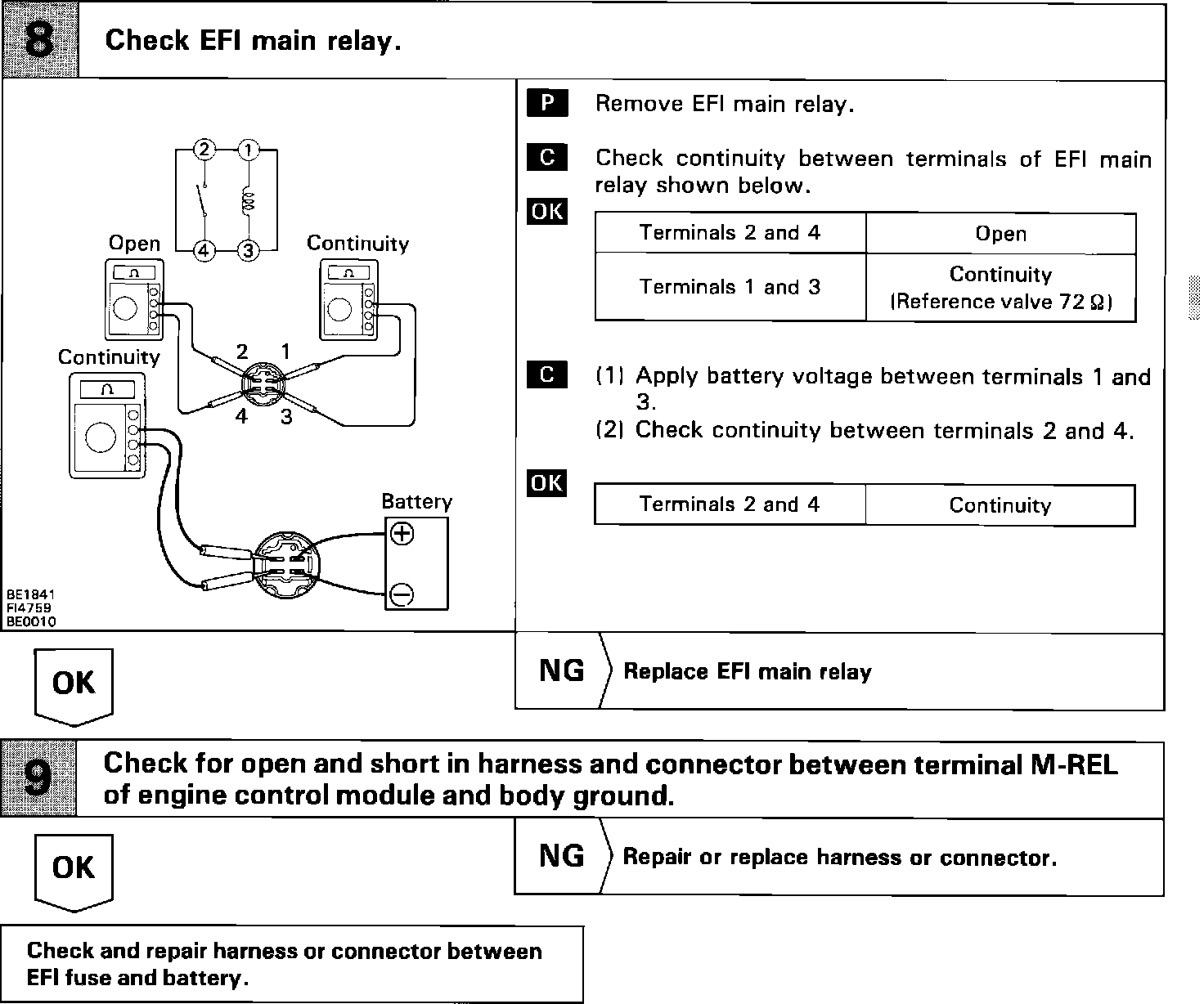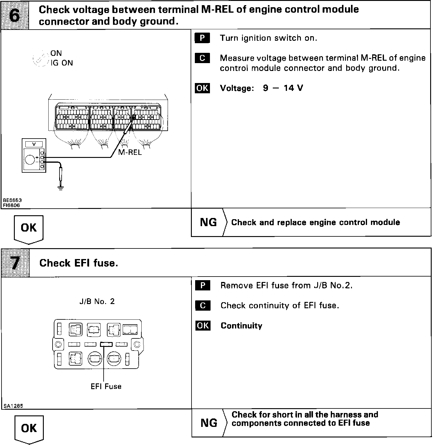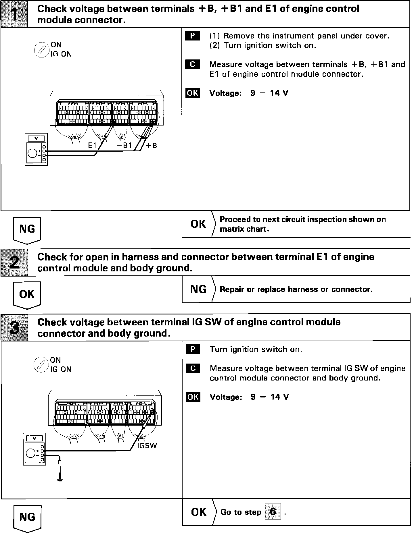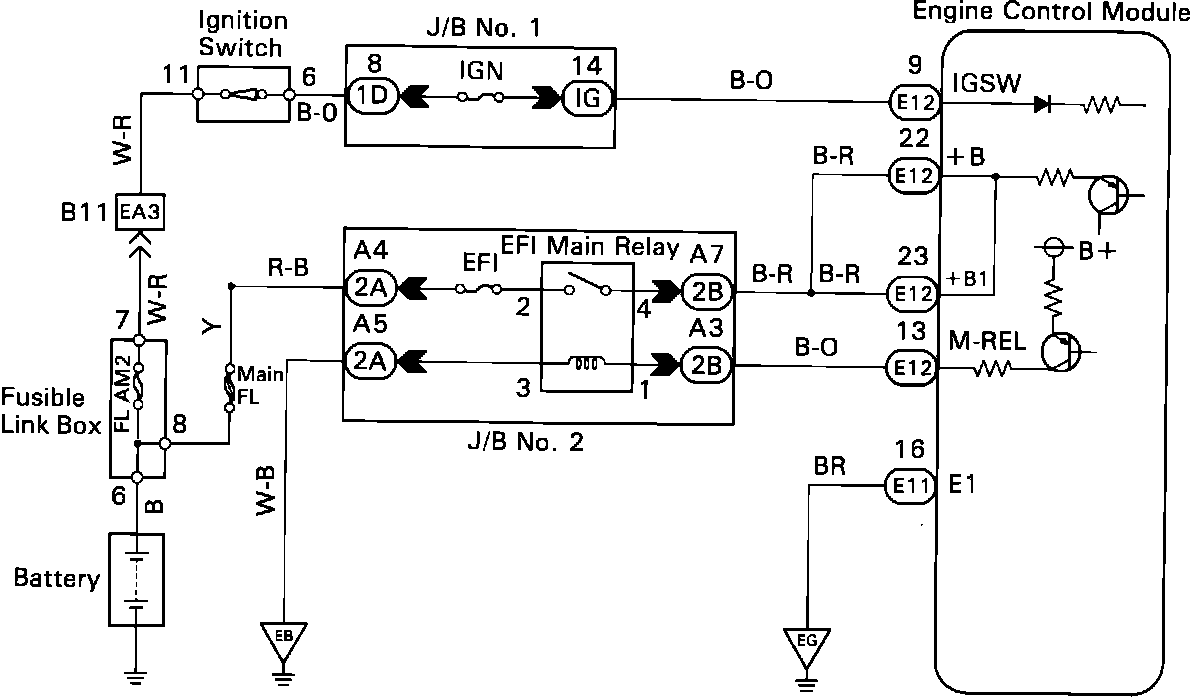 Circuit DescriptionWhen the ignition switch is turned on, battery positive voltage is applied to the terminal IG SW of the engine control module and the main relay control circuit in the engine control module sends a signal to the terminal M-REL of the engine control module switching on the main relay. This signal causes current to flow to the coil, closing the contacts of the main relay and supplying power to the terminals +B and +B1 of the engine control module.