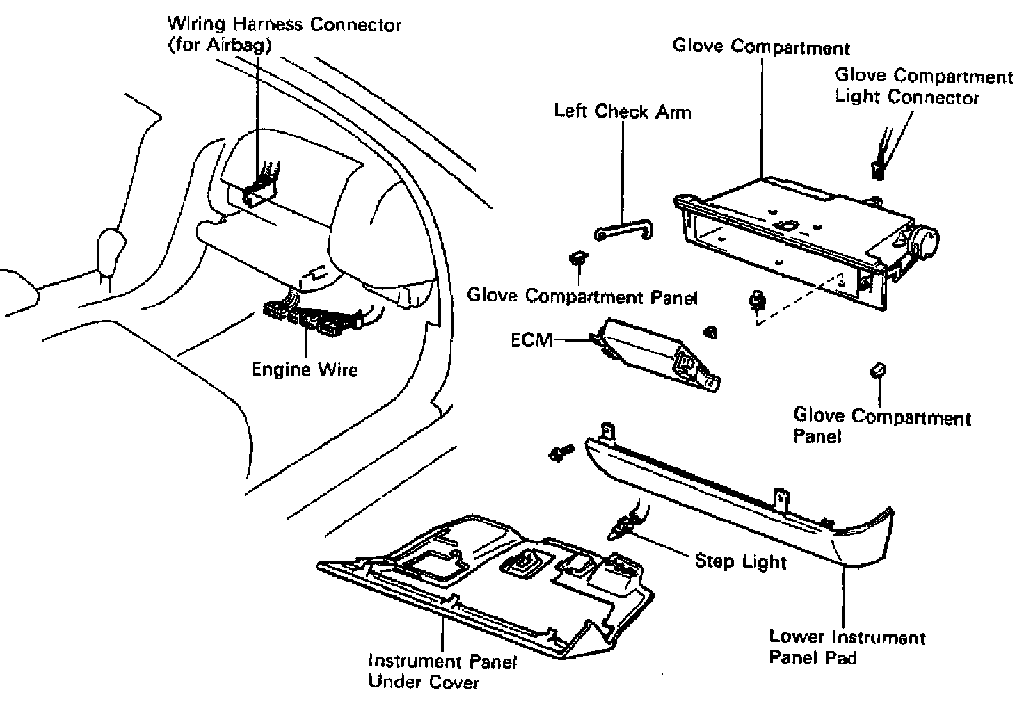 The Engine Control Module (ECM) is mounted on the right side of the instrument panel inside the lower instrument panel pad, below the glove box.