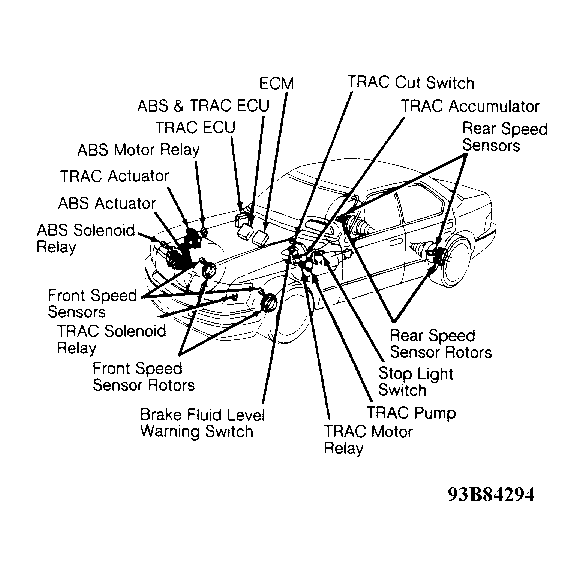 Lexus Traction Control System (TRAC) controls engine torque and braking of driving wheels. TRAC is available as an option on rear wheel drive vehicles. TRAC consists of actuators, accumulator, pump, Vehicle Speed Sensors (VSS), integrated ABS/TRAC ECU, TRAC ECU, relays, solenoids, motor relay, on/off switch, light indicator and warning switch.