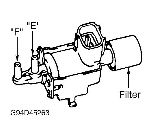 - Blow through port "E". See Figure. Air comes out of filter, but not out of port "F".