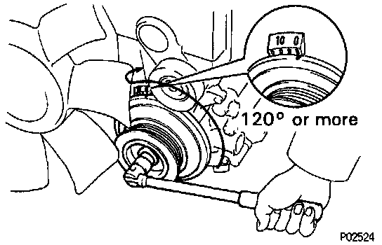 - Turn the crankshaft again clockwise approximately 10° to 40° so that the timing belt cover TDC mark and the crankshaft pulley TDC mark are aligned.