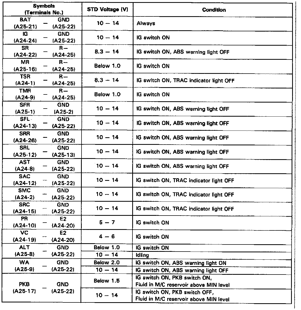 Fig. 44 ABS & TRAC ECU Terminal Values (Part 1 Of 2):