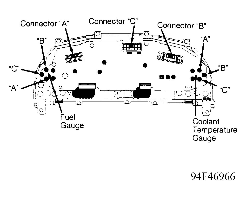 - Disconnect connector "C" from back of instrument cluster. See Figure. At harness side of connector "C", connect a jumper wire to terminal No. 1. See Figure. Connect other end of same jumper wire to corresponding terminal on instrument cluster side of connector "C".