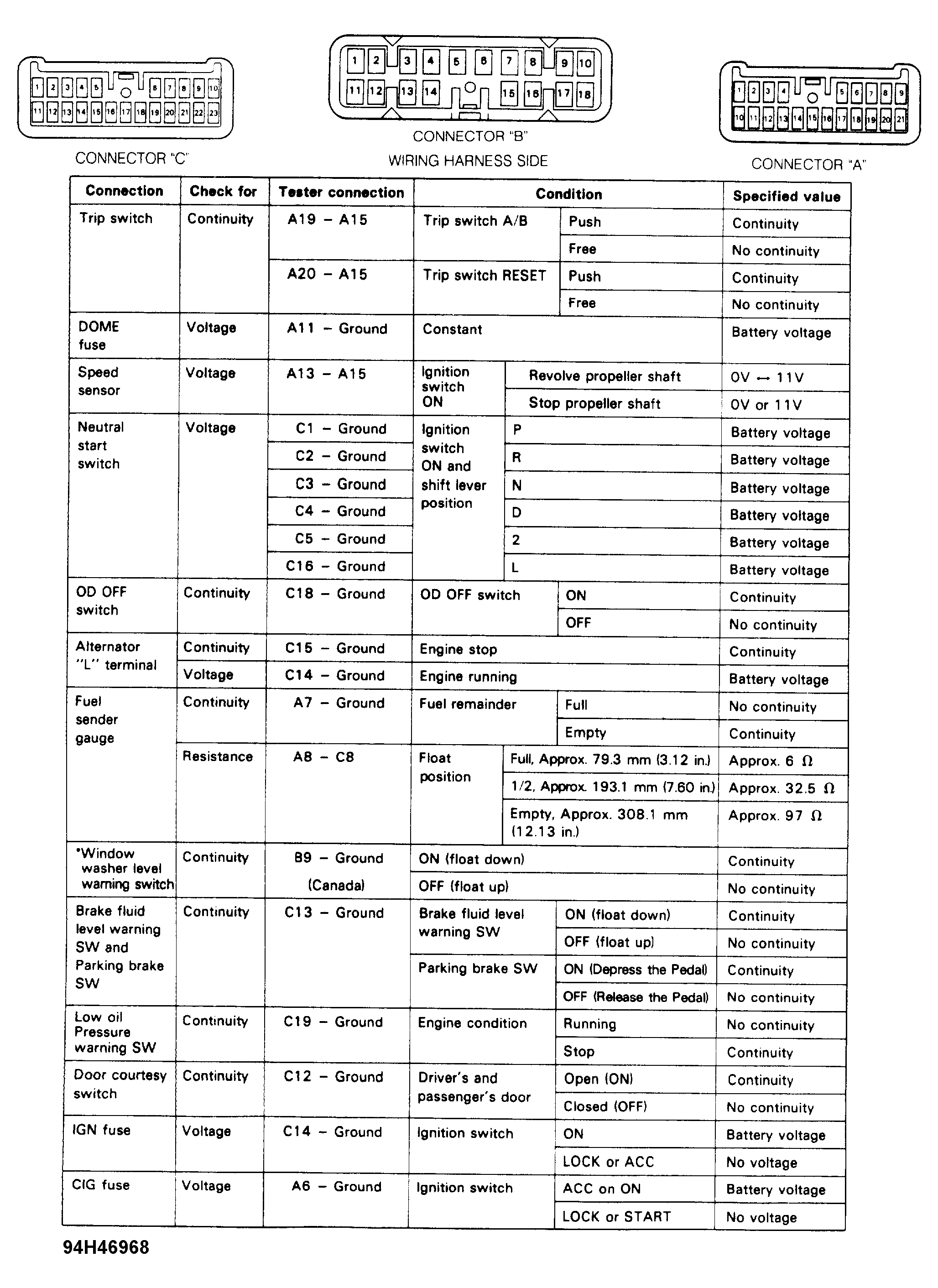 - Disconnect connector "C" from back of instrument cluster. See Figure. Raise and support vehicle with rear wheels off of ground. Turn ignition on. At harness side of connector "C", connect voltmeter between terminals No. 13 and 15. See Figure. Turn ignition on. Rotate drive shaft.