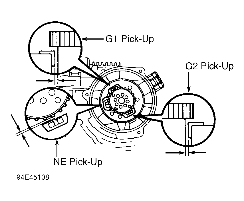 7. Measure air gap of pick-up coils G1, G2 and NE. See Fig 4. See DISTRIBUTOR PICK-UP COIL AIR GAP  table. If air gap is within specification, go to next step. If air gap is not within specification, replace distributor.