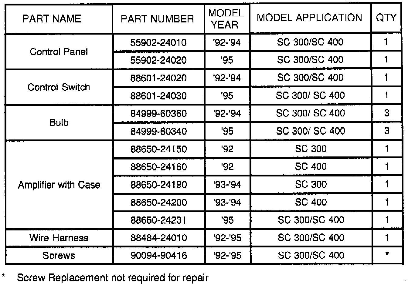 1992 - 1995 SC 300/400 A/C CONTROL ASSEMBLY SERVICE PARTS