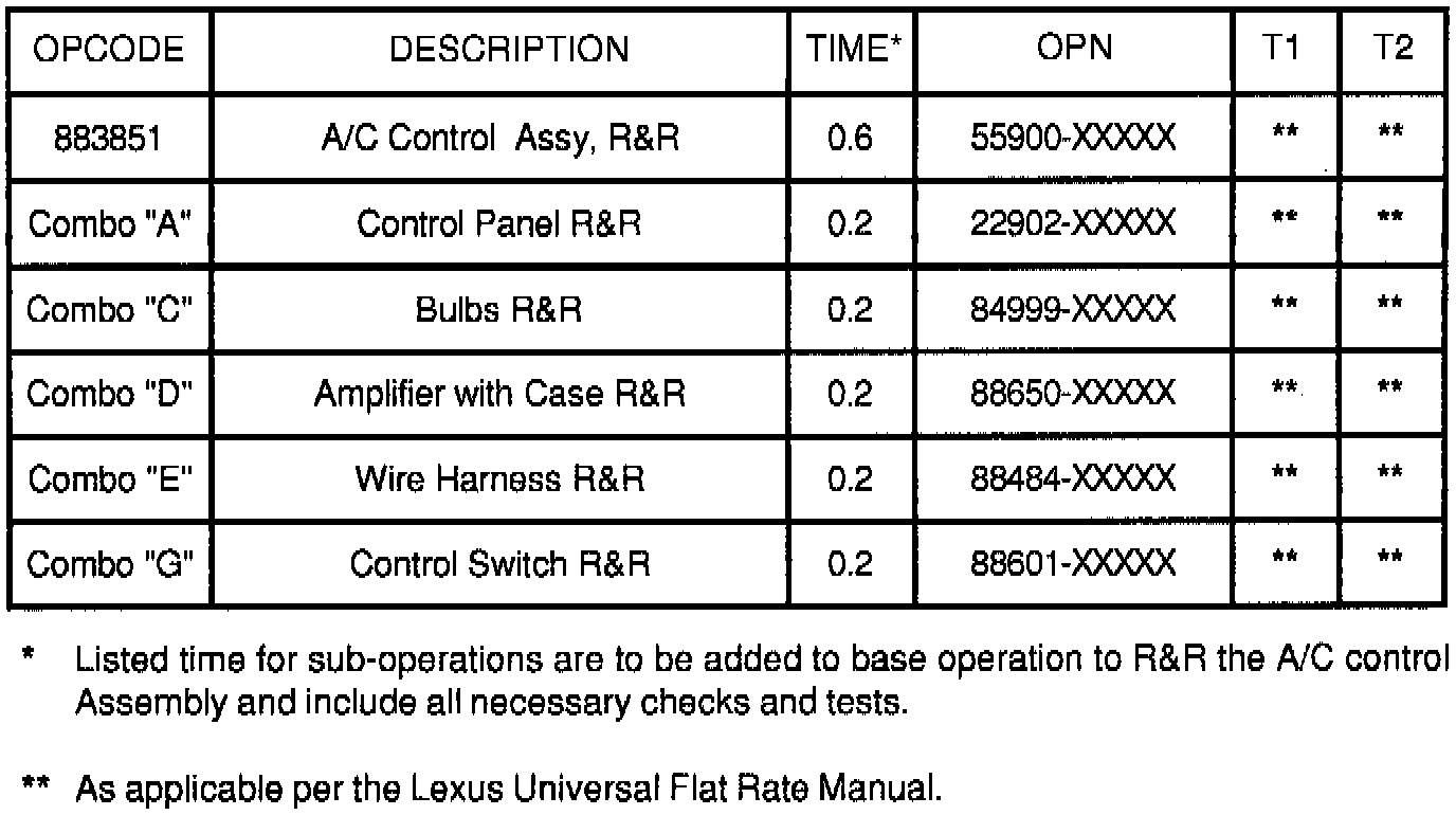 * Listed time for sub-operations are to be added to base operation to R&R the A/C Control Assembly and include all necessary checks and tests.