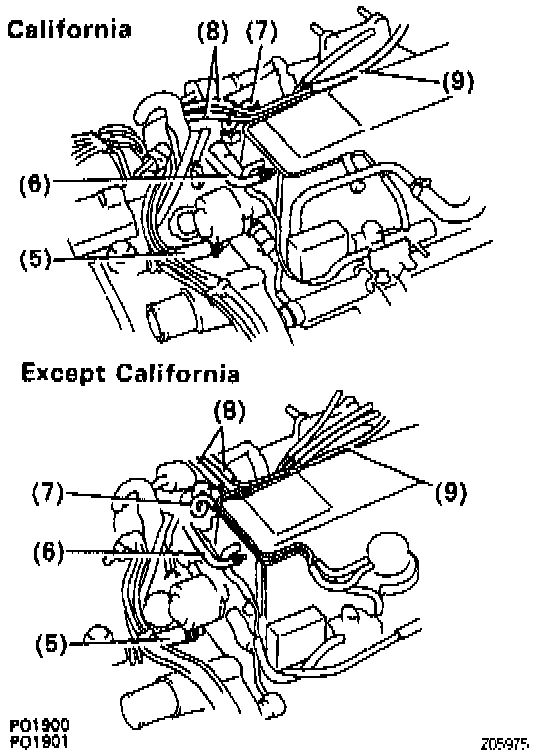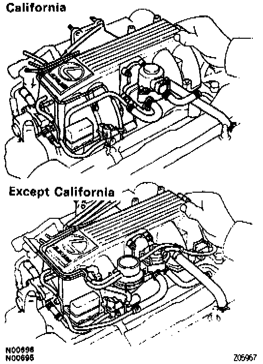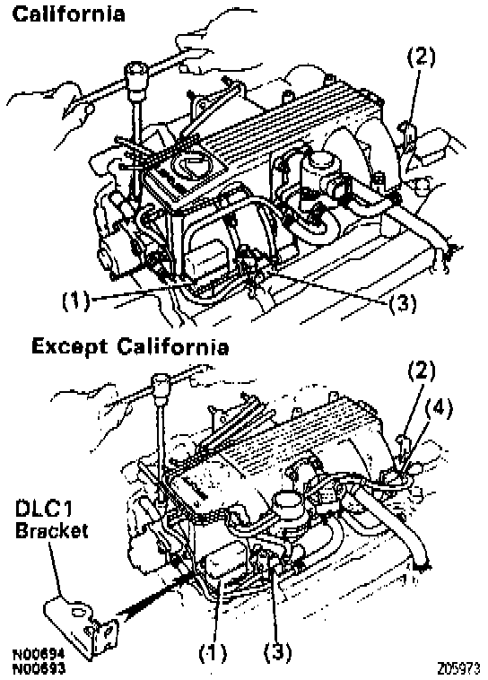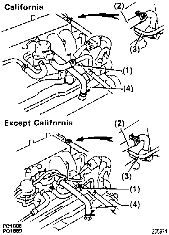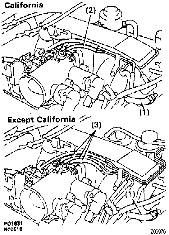 - Except California: vacuum switching valve connector for exhaust gas recirculation.