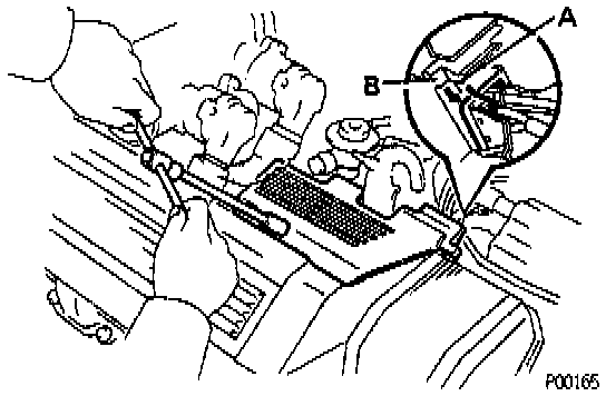 - Fit the portions A and B of the engine wire cover, matching them with the lower high-tension cord cover and No.3 timing belt cover.