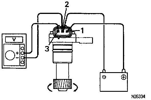 4. Check that there is voltage change from approximately 0.0 volts to 11.0 volts when measured between terminals 2 and 3. The voltage should change 4 times per each revolution. If not as specified, replace the Vehicle Speed Sensor.