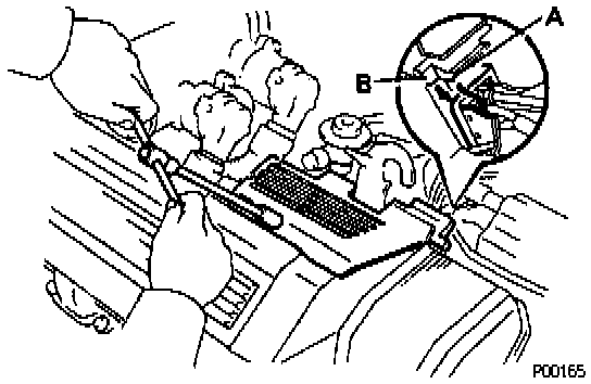 - Fit portions A and B of the engine wire cover, matching them with the lower high-tension cord cover and No. 3 timing belt cover.