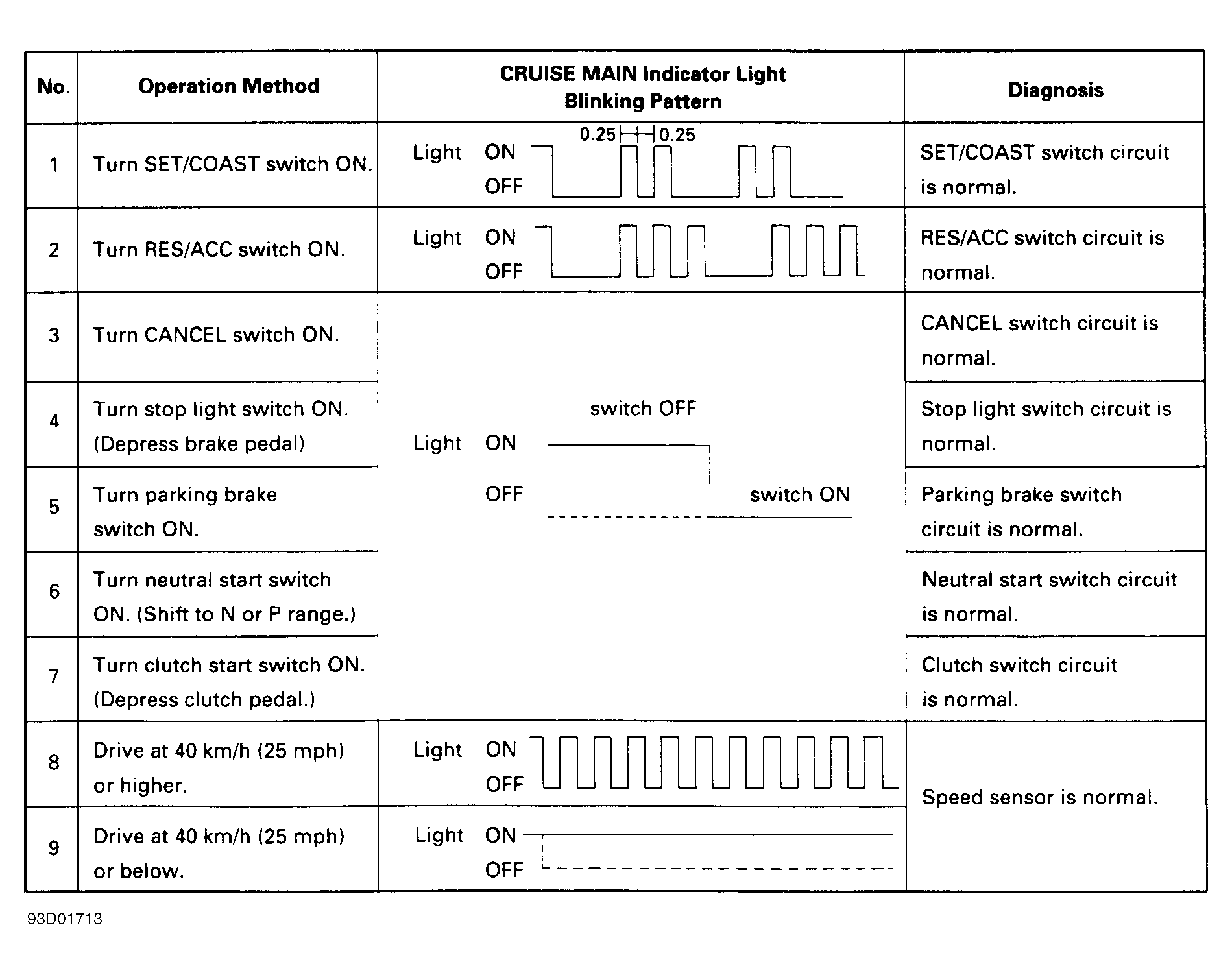 Use this procedure to determine whether cruise control ECU is receiving input signals from various switches and speed sensor. To perform procedure, enter diagnostic mode, then check if CRUISE indicator light responds as it should. See Figure.