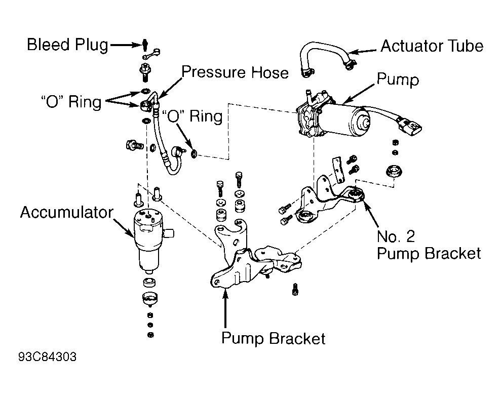 - To install, reverse removal procedure. Tighten assembly mounting bolts. See TORQUE SPECIFICATIONS. Use 2 NEW "O" rings when installing union bolt and pressure hose onto pump and accumulator. Bleed brake and TRAC systems. See BLEEDING BRAKE SYSTEM.