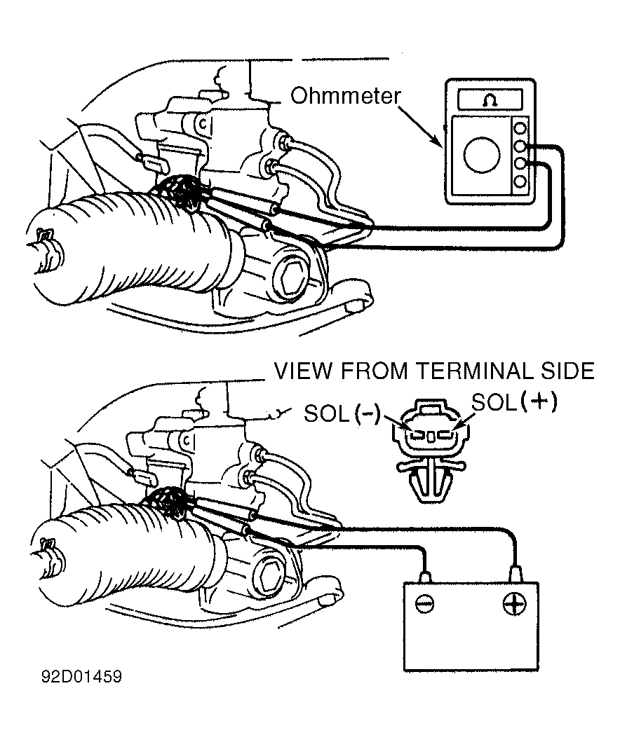 - Unplug wiring connector from solenoid valve. Measure resistance between solenoid valve terminals. See Fig 1. Resistance should be 6-11 ohms. If resistance is not as specified, solenoid valve is defective.