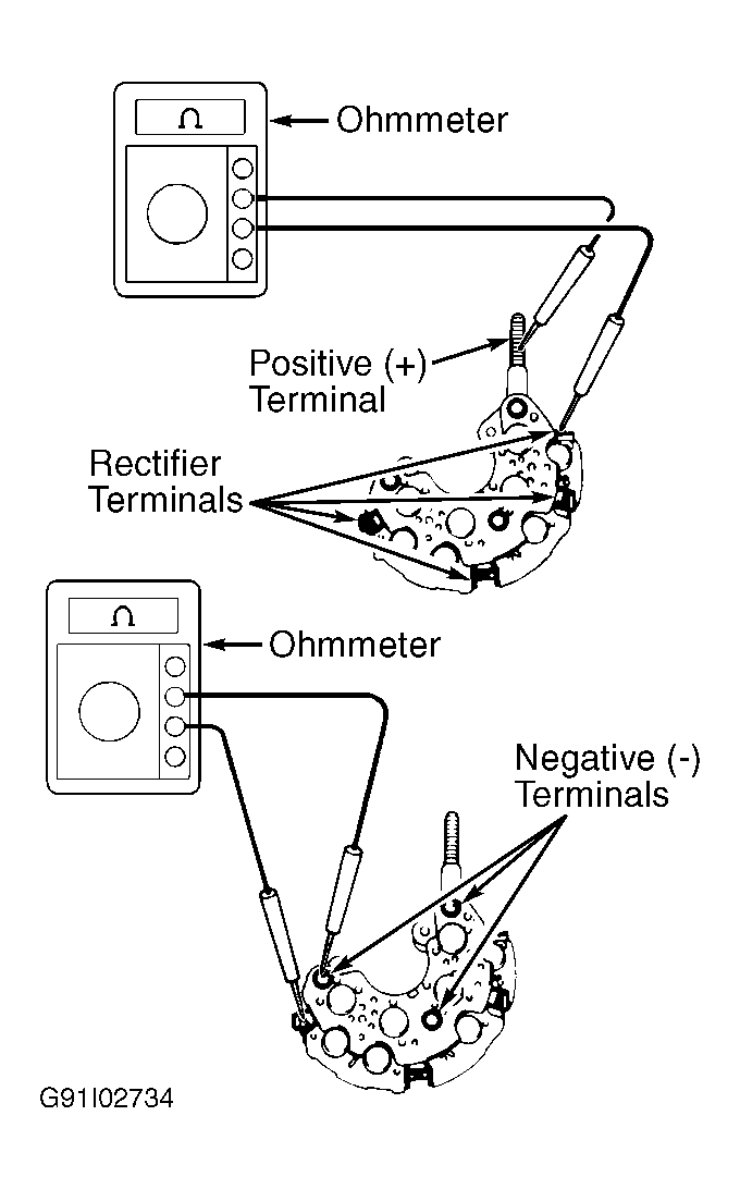 2. Connect ohmmeter positive lead to each rectifier terminal and negative lead to each negative (-) terminal individually. Reverse ohmmeter leads and check again. Continuity should exist in only one direction. If continuity is not as specified, replace diode assembly.