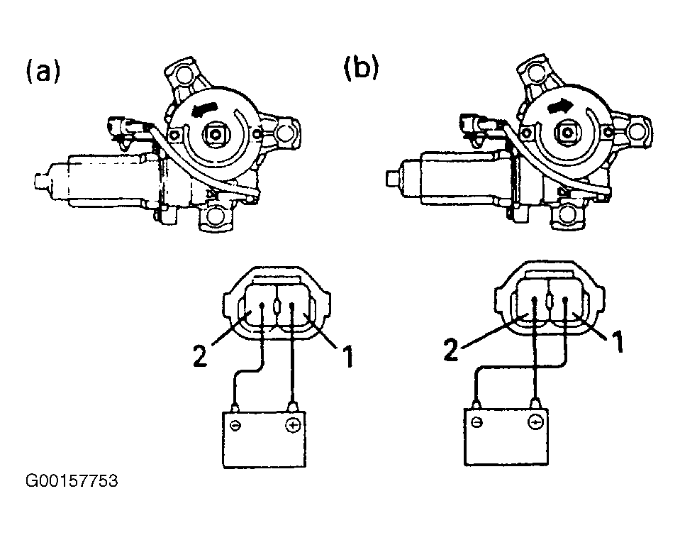 - Connect the positive (+) lead from the battery to terminal 1 and the negative (-) lead to terminal 2, and check that the motor turns counterclockwise. See Fig 1.
