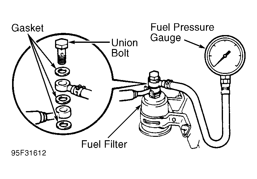 - Disconnect negative battery cable. Remove fuel pressure gauge. Reinstall union bolt using NEW gaskets. Tighten union bolt. Install negative battery cable.
