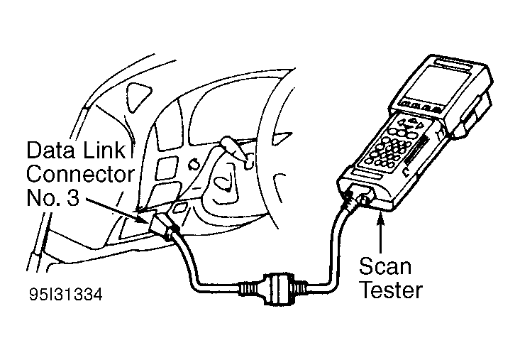 - Install scan tester on data link connector No. 3. See Figure. Turn ignition on. DO NOT start engine.