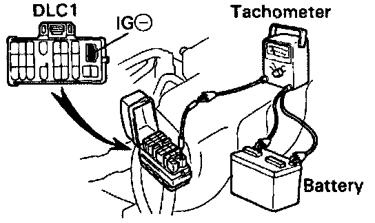 - Connect the tester probe of a tachometer to the terminal IG(-) of the DLC1.