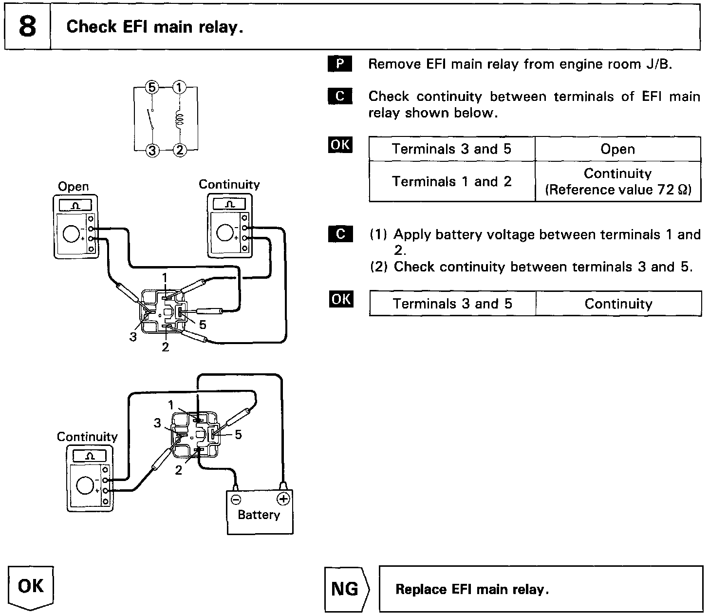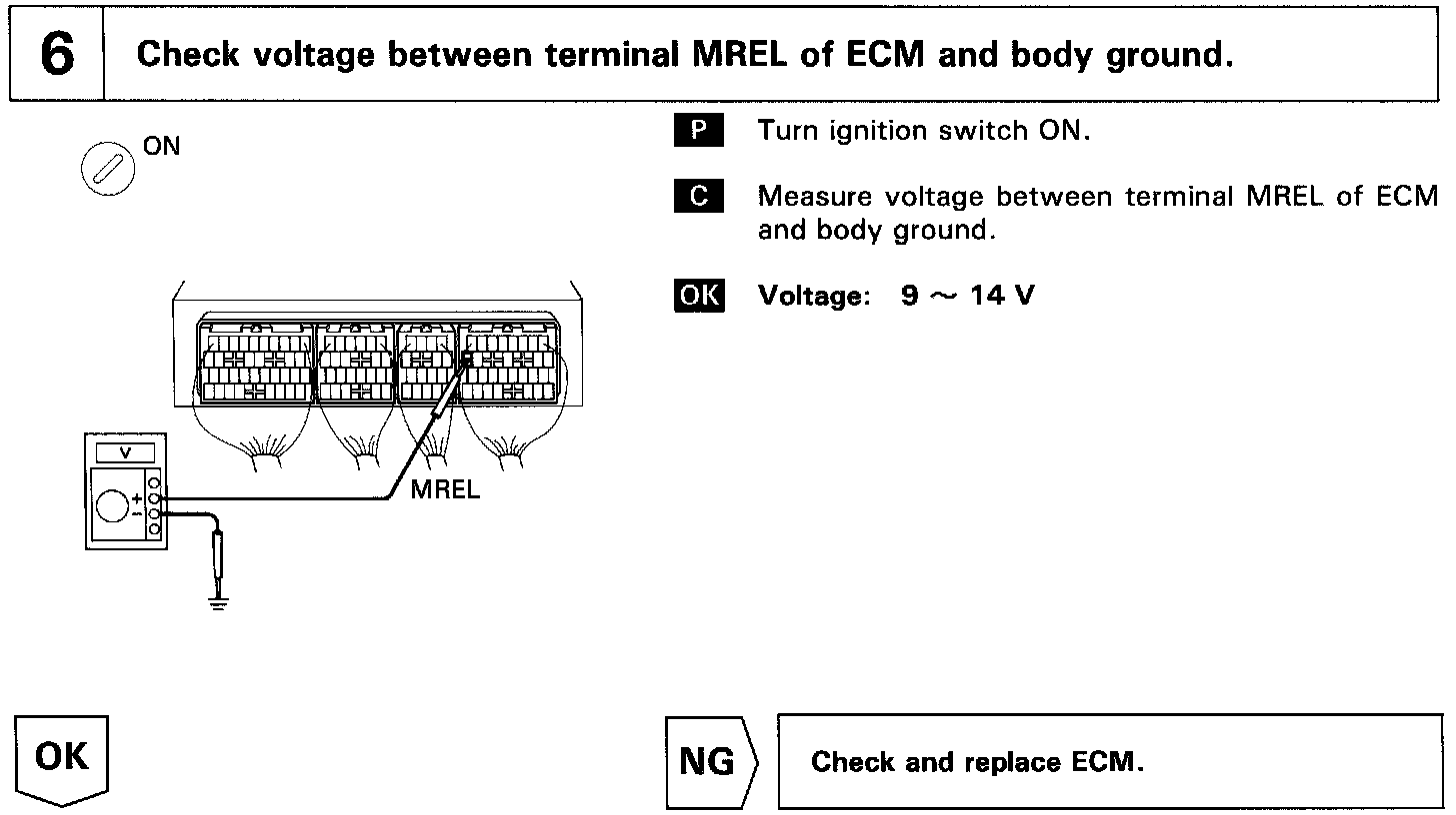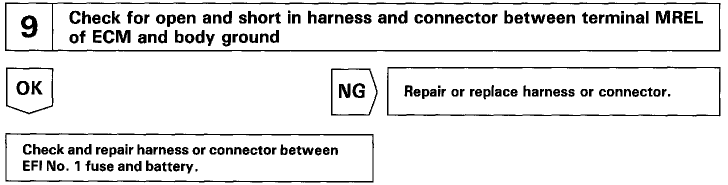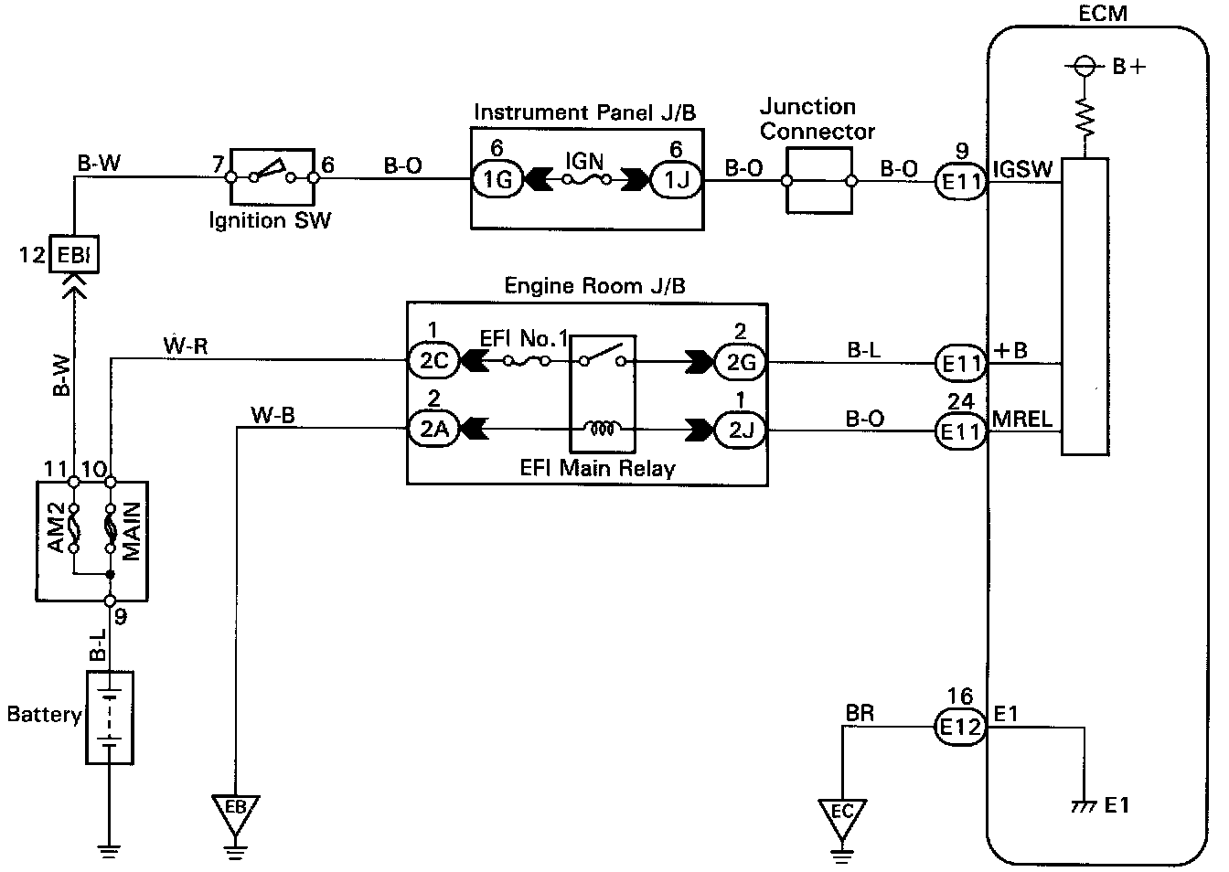 When the ignition switch is turned on, battery positive voltage is applied to the terminal IG SW of the Engine Control Module (ECM) and the EFI main relay control circuit in the ECM sends a signal to the terminal MREL of the ECM switching on the EFI main relay. This signal causes current to flow to the coil, closing the contacts of the EFI main relay and supplying power to the terminals +B of the ECM. If the ignition switch is turned off, the ECM continues to switch on the EFI main relay for a maximum of 2 seconds for the initial setting of the Idle Air Control (IAC) valve.