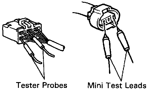 When inserting tester probes into a connector, insert them from the rear of the connector. When necessary, use mini test leads. For water resistant connectors which cannot be accessed from behind, take good care not to deform the connector terminals.