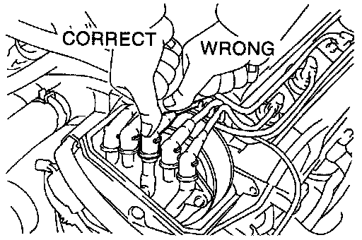 NOTICE: Install the high-tension cord by pressing on the correct piece as shown in the illustration. If not done this way the high-tension cord will interfere with the camshaft timing pulley.