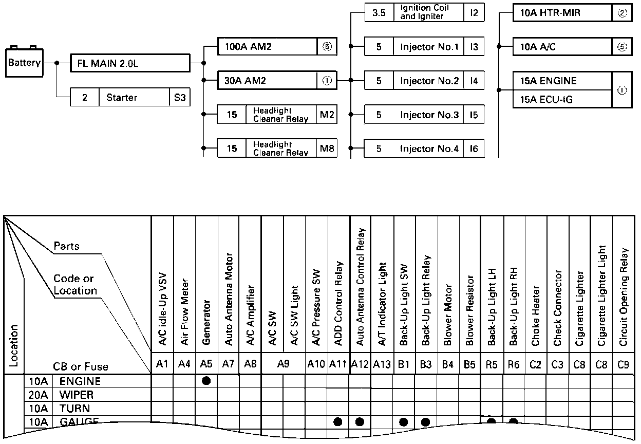 The Chart shows the route by which current flows from the battery to each electrical source (Fusible Link, Circuit Breaker, Fuse, etc.) and other parts