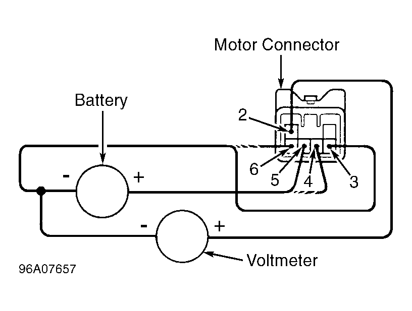 8. Connect battery voltage between terminals No. 6 (positive lead) and No. 5 (negative lead) at motor connector. See Fig 2. Connect voltmeter between ground and terminal No. 2 of motor connector. While watching voltmeter, connect battery voltage between terminals No. 3 (positive lead) and No. 4 (negative lead) at motor connector. Go to next step.