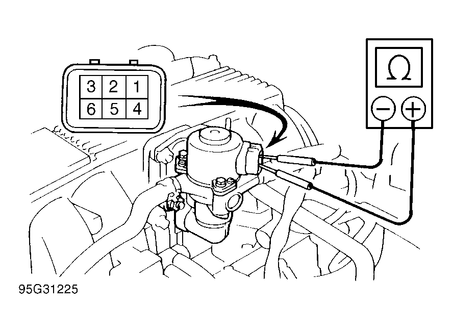 - Disconnect IAC valve connector. Measure resistance between terminals No. 4 and 5, No. 5 and 6, No. 1 and 2 and between terminals No. 2 and 3 at IAC valve harness connector. See Figure. If each reading is 10-30 ohms, go to next step. If any reading is not 10-30 ohms, replace IAC valve.