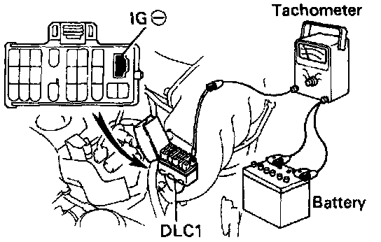 - Connect the tester probe of a tachometer to terminal IG(-) of the DLC1.