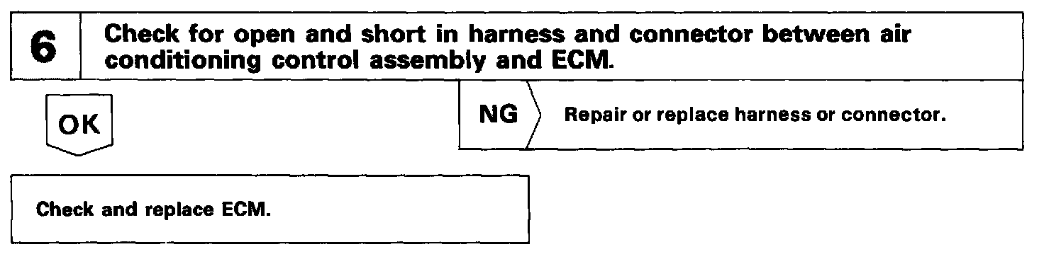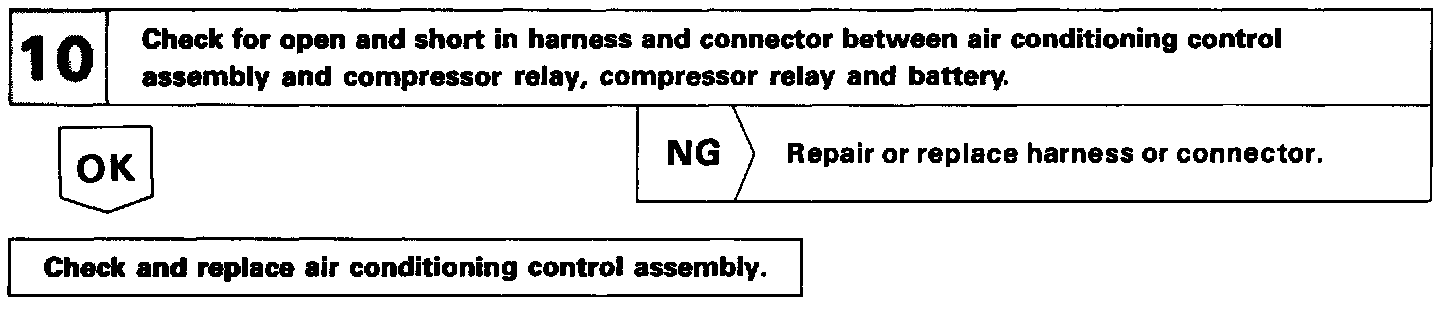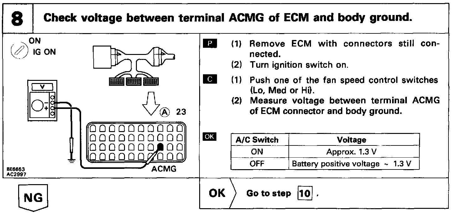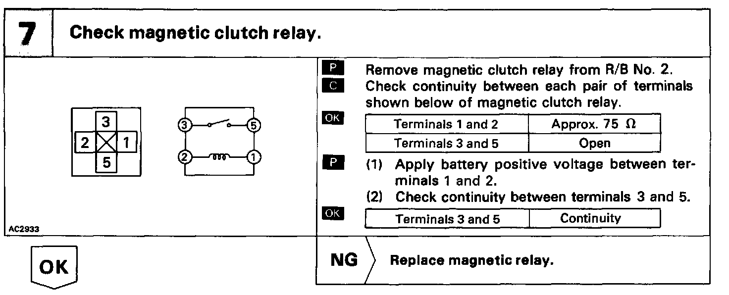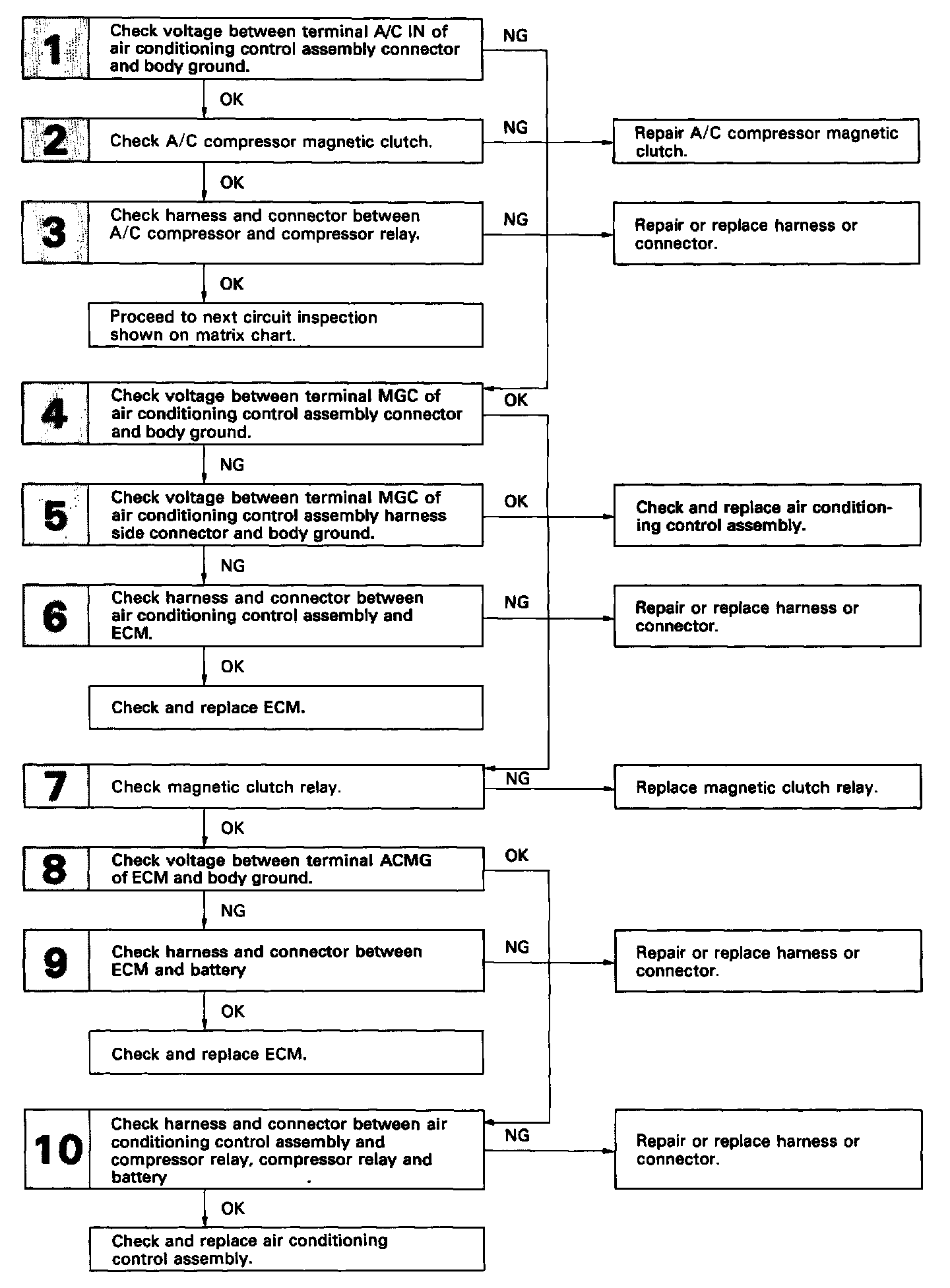 When the ECM receives this signal, it sends a signal from terminal ACMG and switches the A/C magnetic clutch relay on, thus turning on the A/C magnetic clutch.