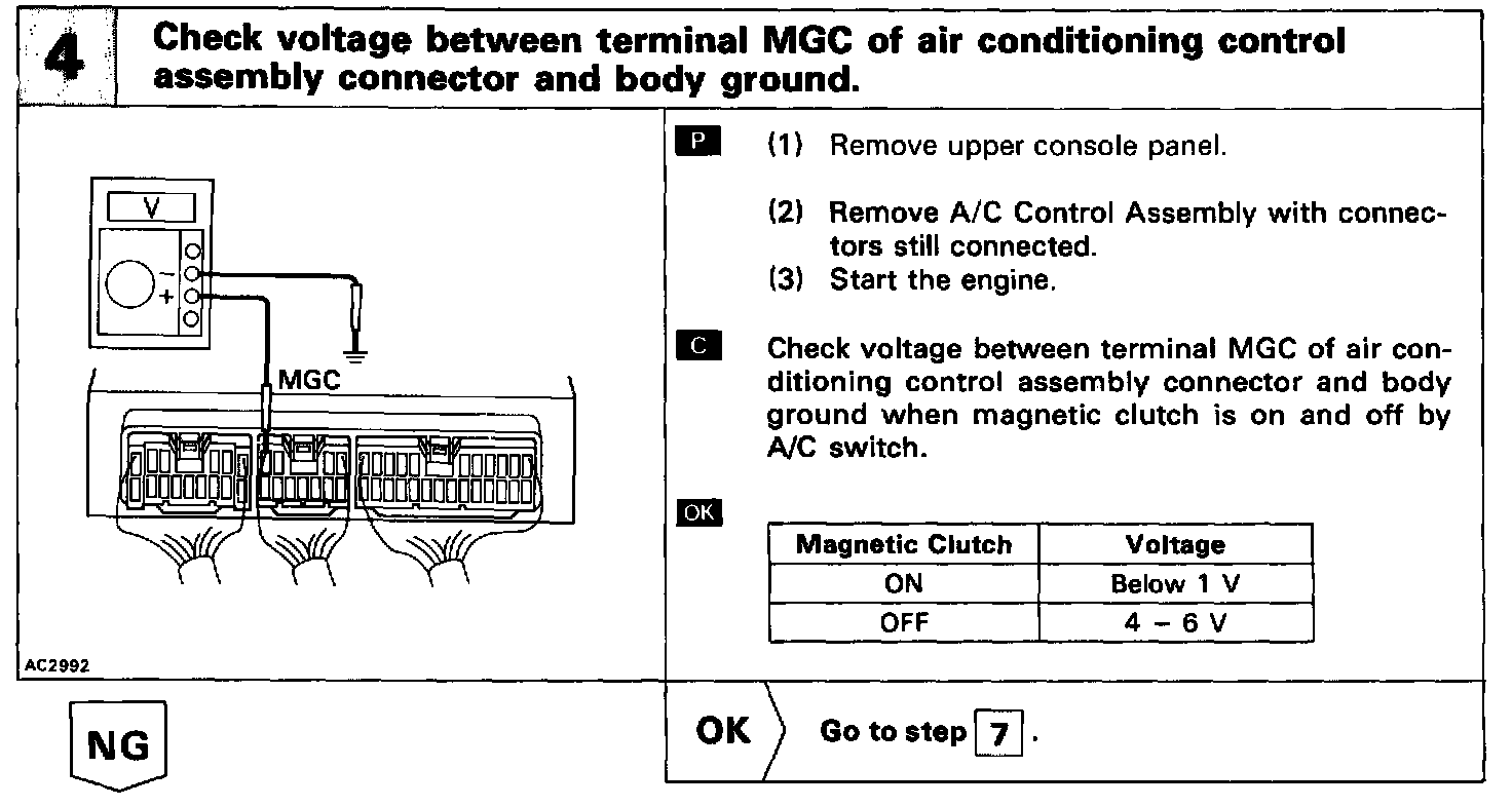 The air conditioning control assembly outputs the magnetic clutch ON signal from terminal MGC to the ECM.