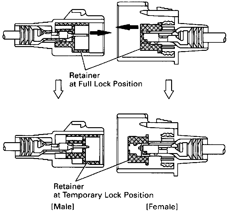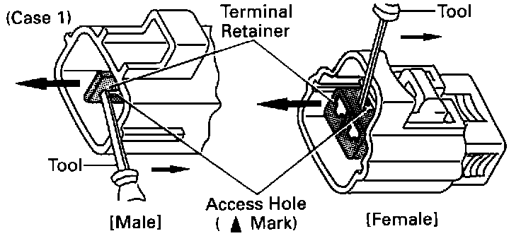 Type which cannot be pulled as far as Power Lock insert the tool straight into the access hole of terminal retainer as shown.Push the terminal retainer down to the temporary lock position.