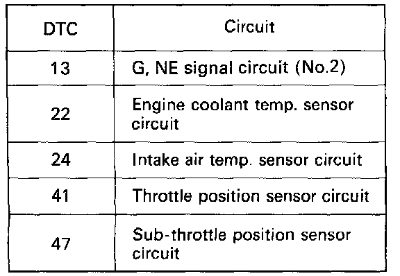 Abnormality detection ability in the test mode is increased compared to that in the normal mode, so that when intermittent problems or momentary shorts occur in the ECM signal circuits (G1, G2, NE, THW, THA VTA1, VTA2) shown in the table opposite the appropriate diagnostic trouble code is output.Accordingly, when the diagnostic trouble codes shown in the image above (13, 22, 24, 41 , 47) are output during the diagnostic trouble code check, and inspection of the appropriate circuits reveals no abnormality, perform the check for Intermittent Problem as described opposite.