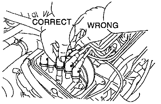 NOTICE: Install the high-tension cord by pressing on the correct place as shown in the illustration. If not done this way, the high-tension cord will interfere with the camshaft timing pulley.